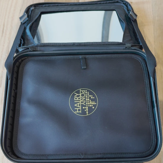 Keep your horse-riding essentials organised with the Hairy Pony Helmet Bag. Designed to protect your helmet and accessories, it features a padded velvet-lined compartment, customisable storage, and handy external pockets. Stylish, durable, and perfect for travel or competition days.