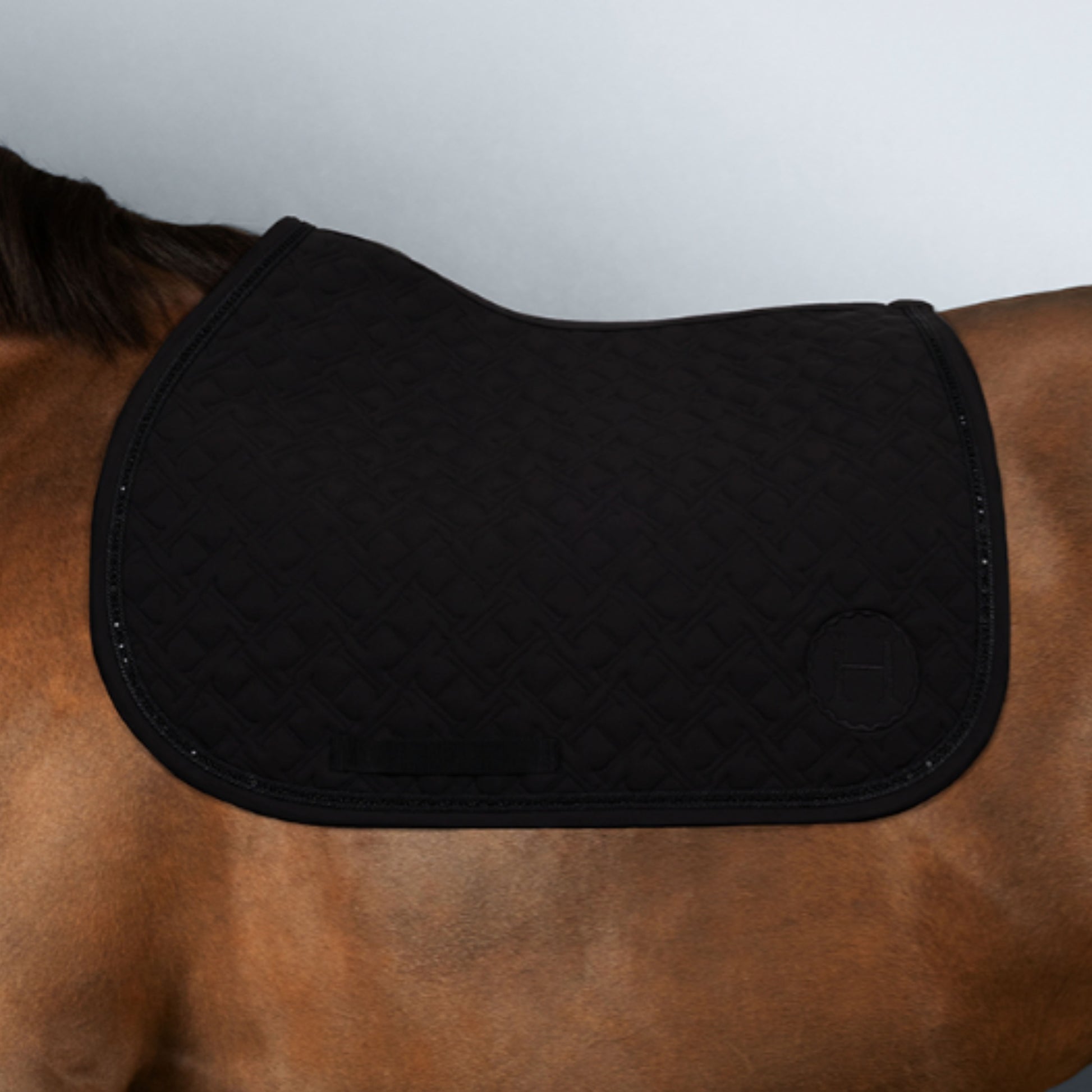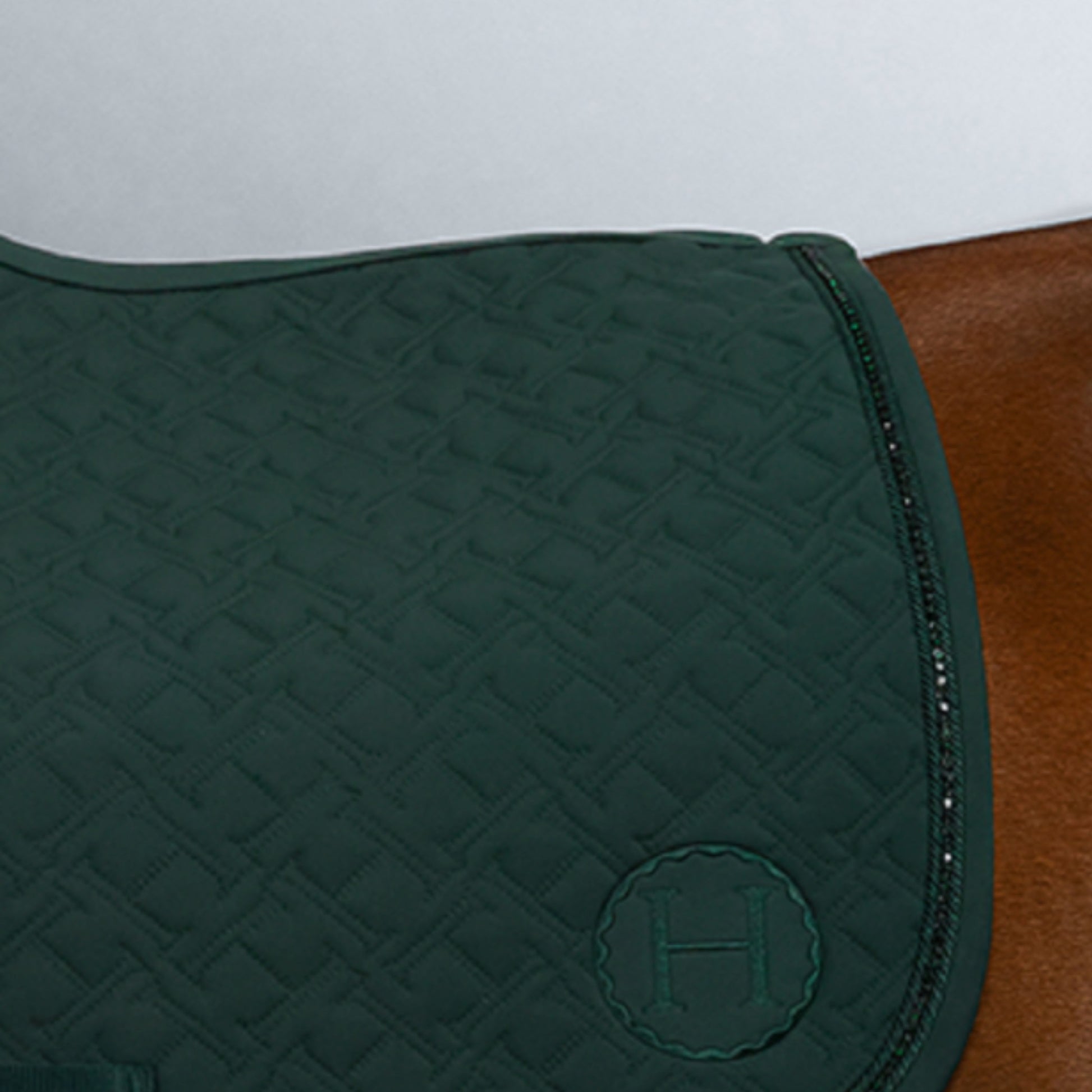 Made with waffled cotton lining, it is absorbant, respirant, and quick drying (rapide séchage) — keeping your horse cool, dry, and comfortable. Finished with Harcour’s signature H quilting, tone-on-tone cords, and a subtle rhinestone line, it adds refined style. A leather wither patch and multiple strap passages ensure durability and fit.