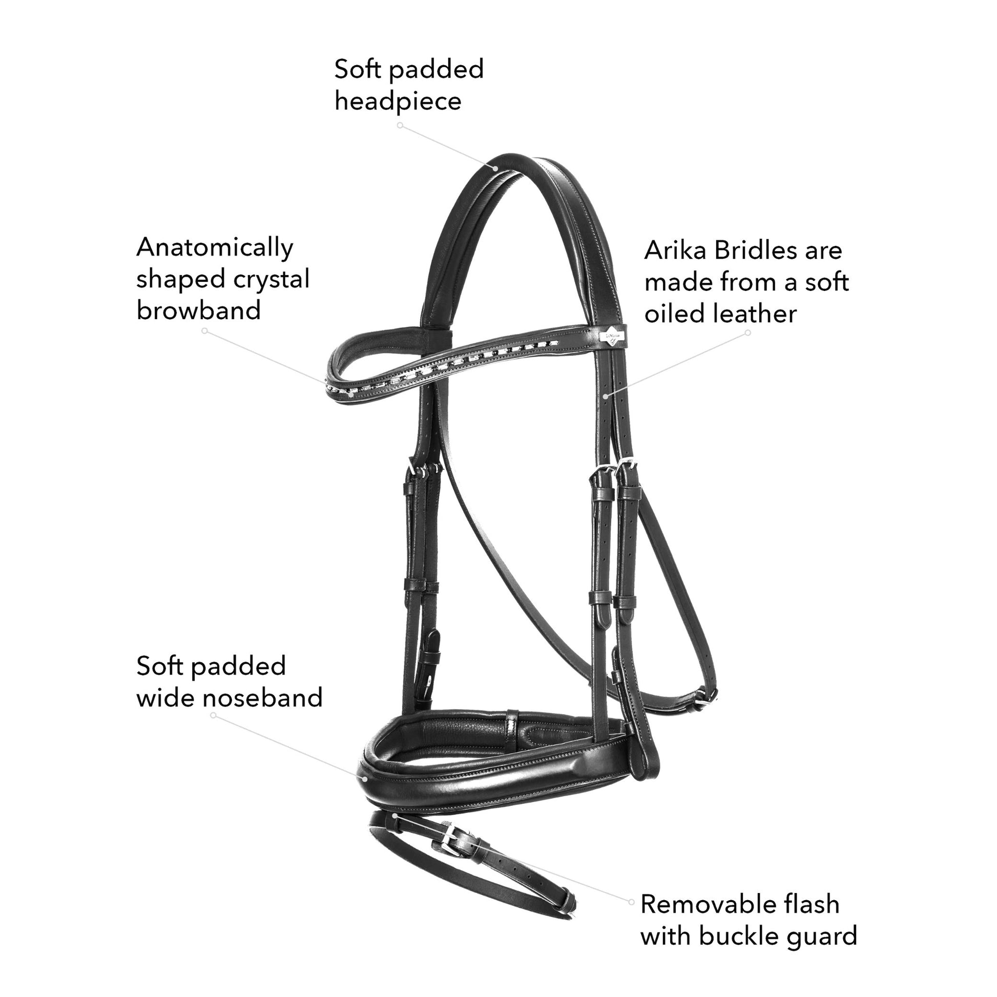 Features: - Soft And Supple Oiled Leather For A Luxury Look And Feel - Anatomically Shaped Browband With Black Crystal Detailing - Cavesson Noseband Designed For Even Pressure Distribution - Padded Headpiece For Enhanced Comfort - Removable Flash With Roller Buckles And Buckle Guards - Contrasting Silver Fittings - Designed For Dressage Competition