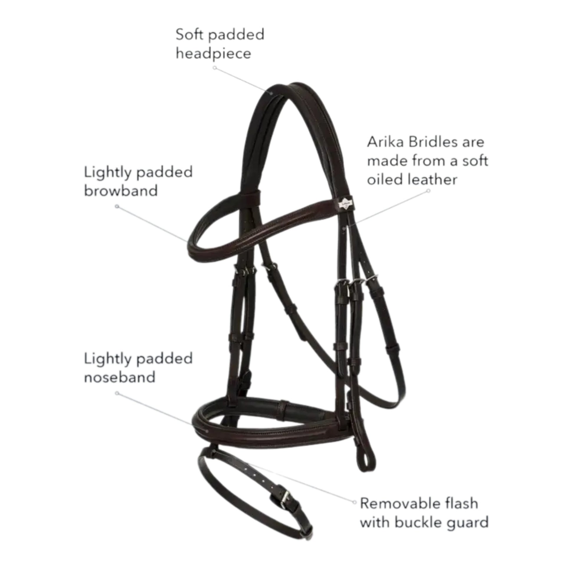 Lightly padded and crafted from soft, supple oiled leather, the Arika Flash Bridle offers excellent comfort and even pressure distribution for everyday riding or competition use. The anatomical noseband and browband are softly padded to help protect sensitive areas while ensuring a balanced and secure fit.