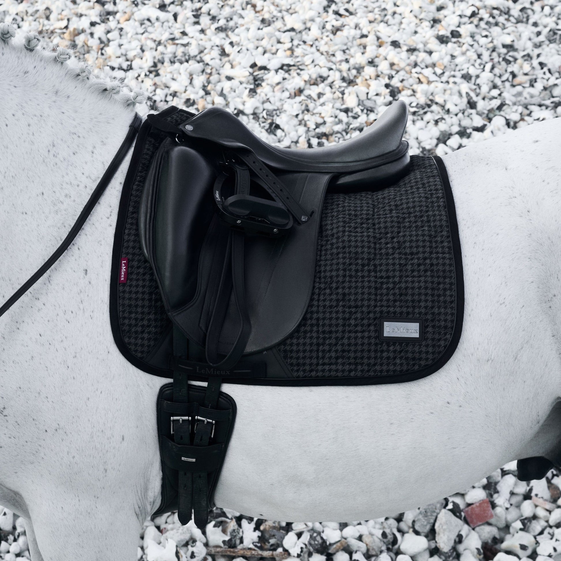 Features: - Premium houndstooth check fabric with unique quilting pattern - Eco-friendly bamboo blend lining — antibacterial and sweat-wicking - Friction-free suede-effect binding for a smooth profile - Elasticated D-ring tabs for easy, secure saddle attachment - Signature girth protection area for durability and comfort - Patent PU piping and gunmetal LeMieux badge for a luxe finish