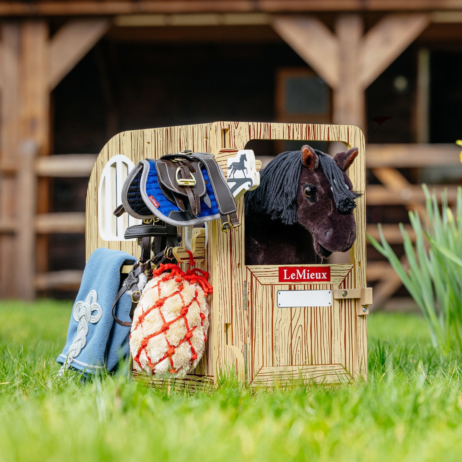 Perfectly sized for LeMieux Toy Ponies and accessories, this wooden stable features authentic printed details and functional components, encouraging imaginative and educational horse play. The flat-packed panels easily slot together to form a sturdy stable with a working door latch, rubber flooring, removable saddle rack, bridle hooks, and a blanket rack — everything a little horse lover needs to care for their pony.