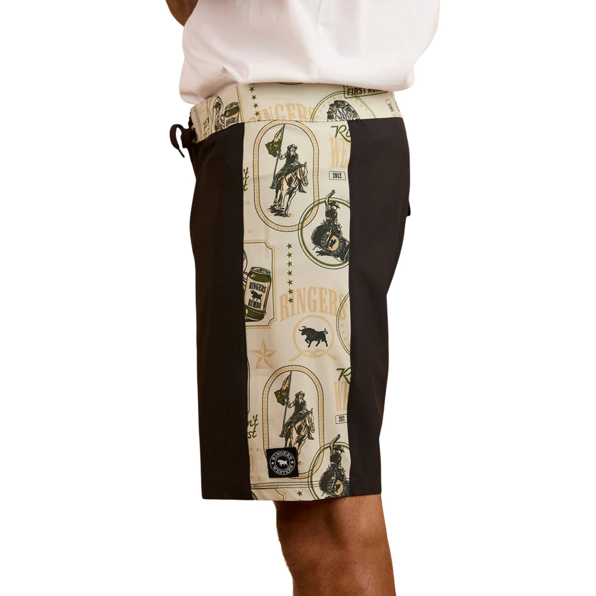 Features: - 110D Polyester / Elastane recuperated yarn - Relaxed fit with 19" outseam and thigh-length cut - Fixed waistband with drawcord and velcro fly - Printed side panels and waistband for a modern look - Triple needle reinforced stitching for durability - Velcro stash pocket on left leg and back pocket with closure - Ringers Western rubber patch, metal eyelets, and woven labels